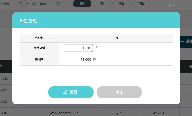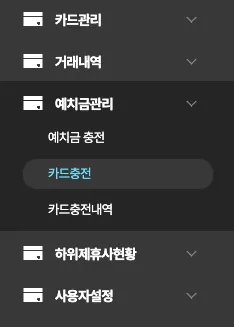 좌측 메뉴에서 예치금 관리 - 카드충전 클릭