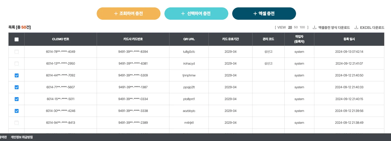 충전을 원하는 카드 왼쪽의 체크박스 클릭 - 상단의 선택하여 충전 클릭