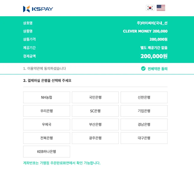 전체약관 동의 및 결제할 은행 선택 - 가상계좌 발급