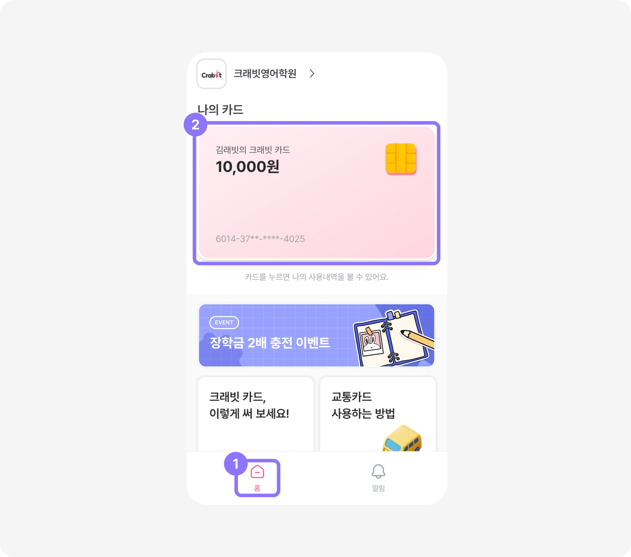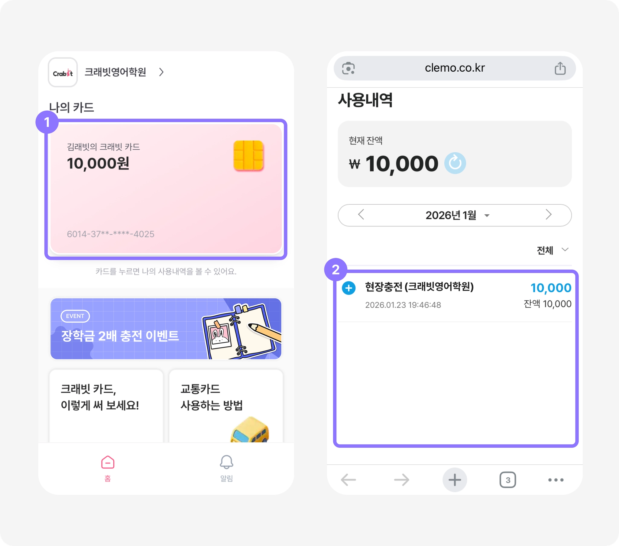 카드를 누르면, 카드 충전 내역과 사용 내역을 실시간으로 볼 수 있어요