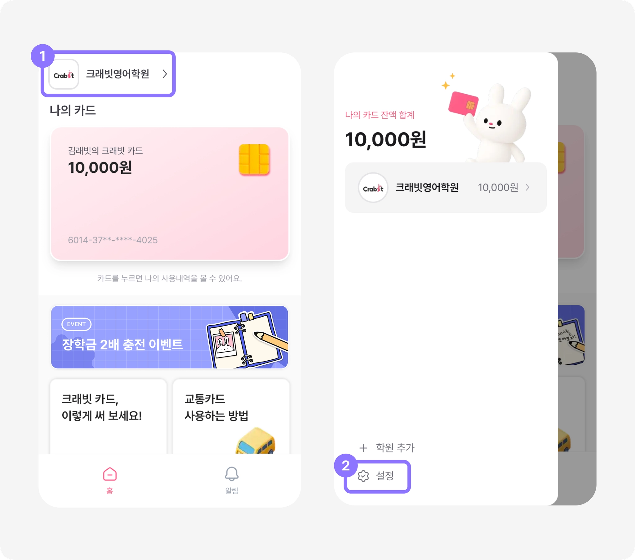 홈 화면 상단 [학원 이름] - 메뉴가 열리면 [설정] 으로 들어가 주세요