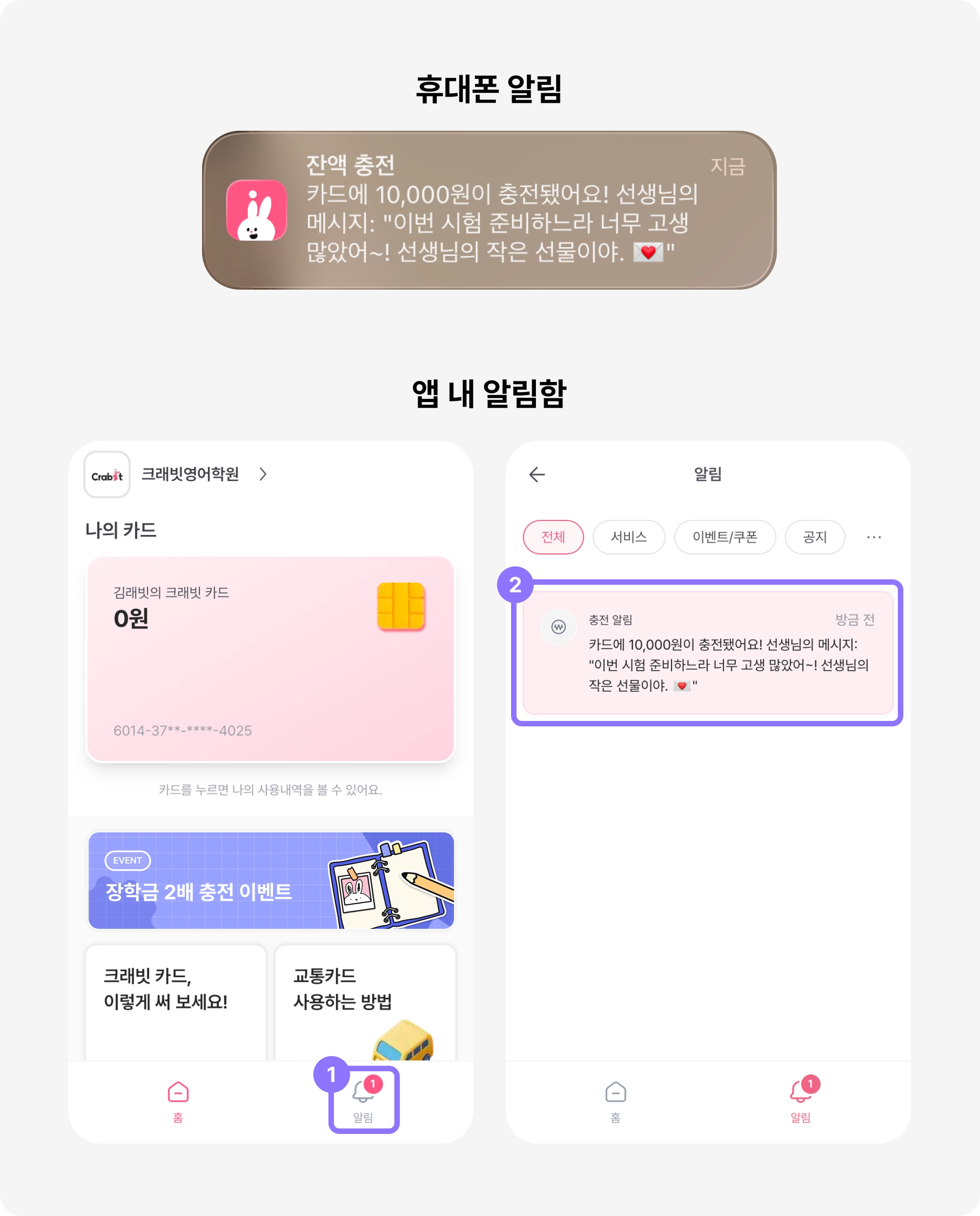 카드에 장학금이 충전되면, 실시간 알림을 받을 수 있어요