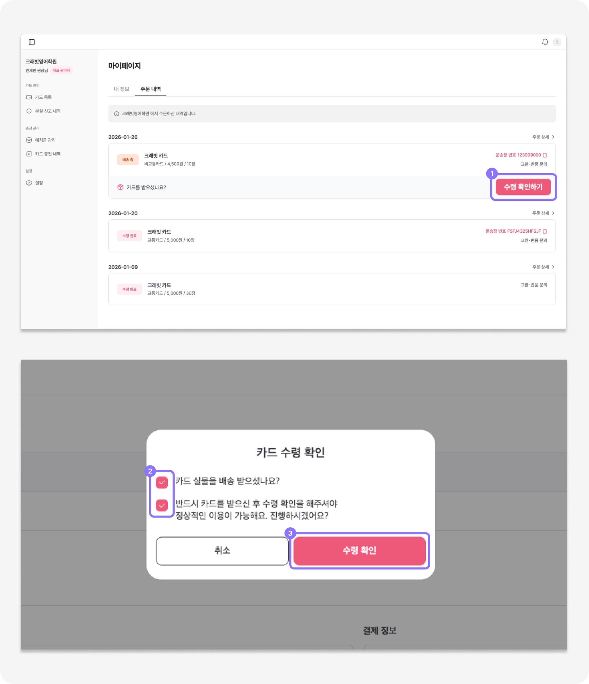 수령 완료 : 실물 카드를 받은 후, 카드 수령 확인을 했어요.