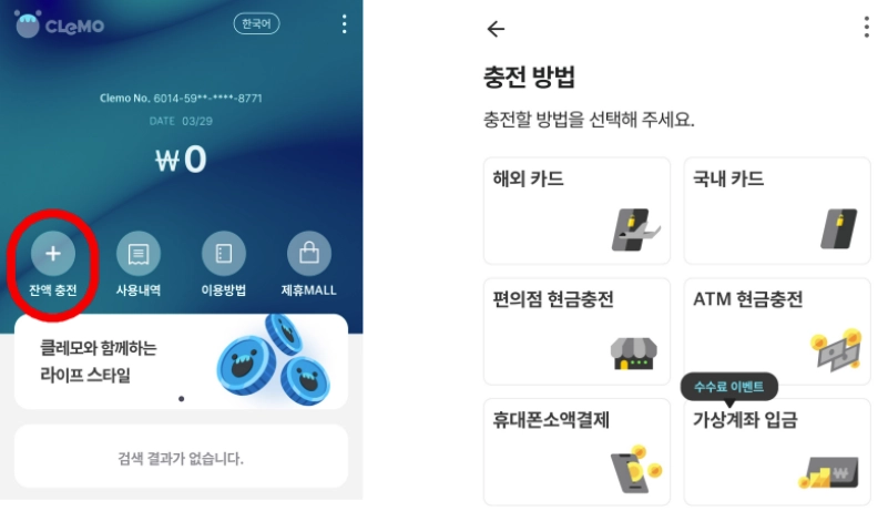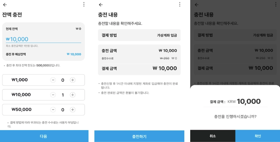 현재 가상계좌로 충전은 수수료가 없으니 이 방식을 추천드려요.