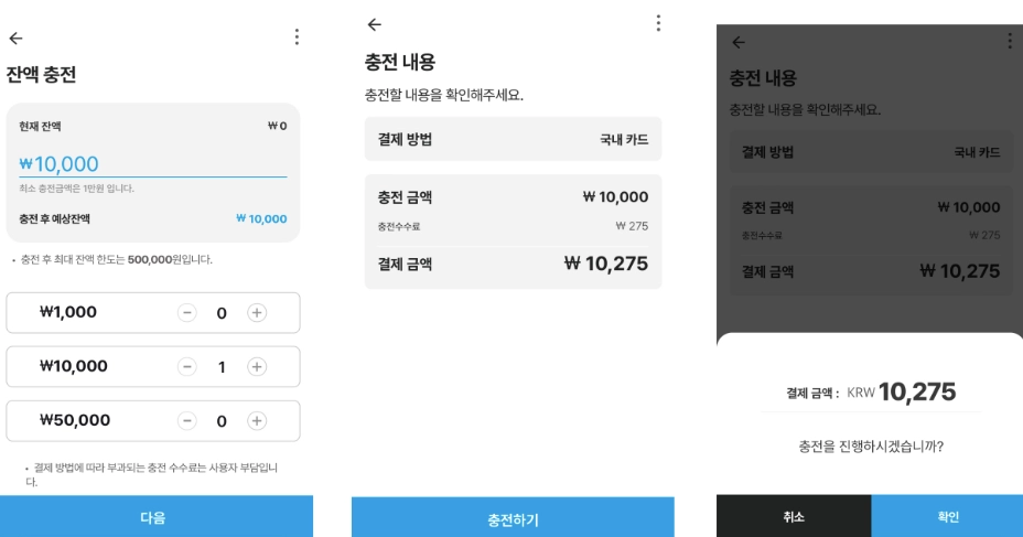 1만원 충전 시, 275원 수수료 ⇒ 총 결제 금액 10,275원