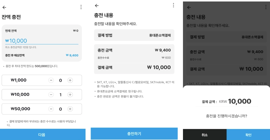 1만원 충전 시, 600원 수수료 ⇒ 총 결제 금액 10,000원