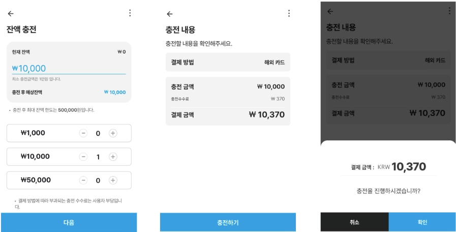 1만원 충전 시, 370원 수수료 ⇒ 총 결제 금액 10,370원