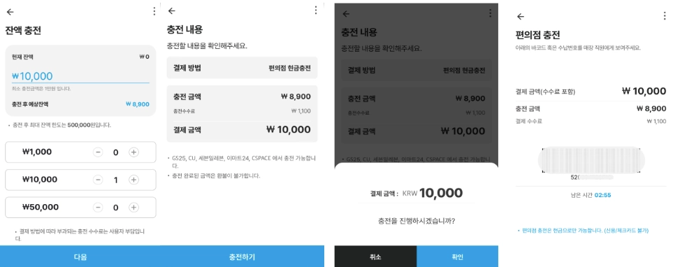 편의점 현금 충전 (현장): 결제금액 상관없이 수수료 1,100원 / 무조건 현금만 가능!!