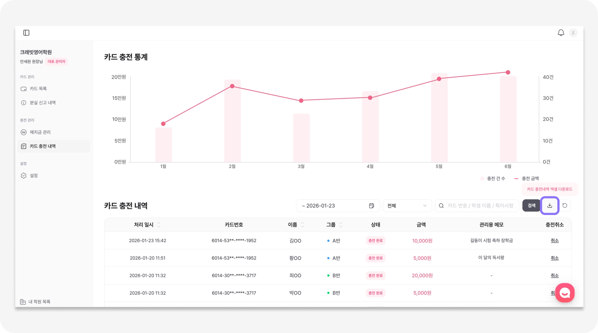 표 우측 상단의 버튼을 통해, 카드 충전 내역 엑셀 파일을 받을 수 있어요