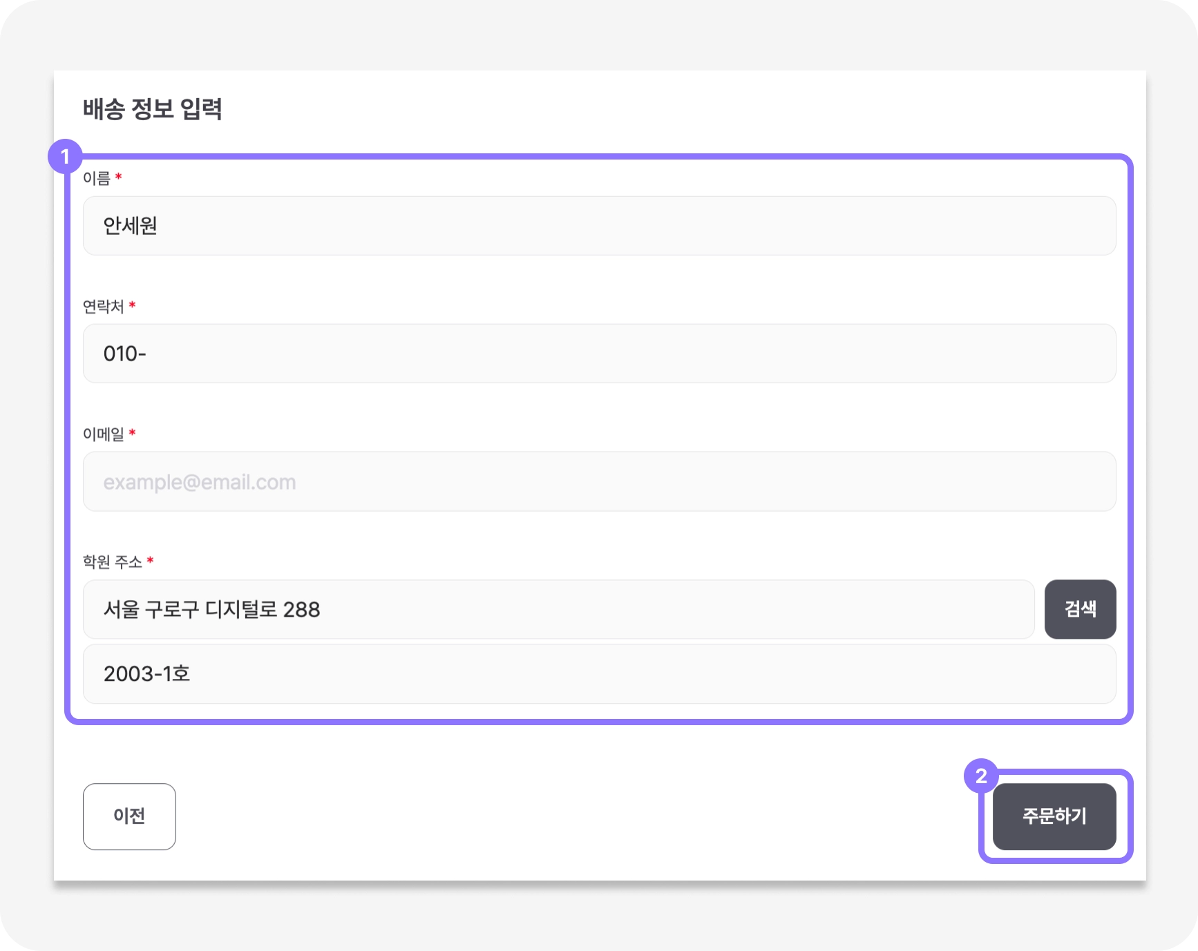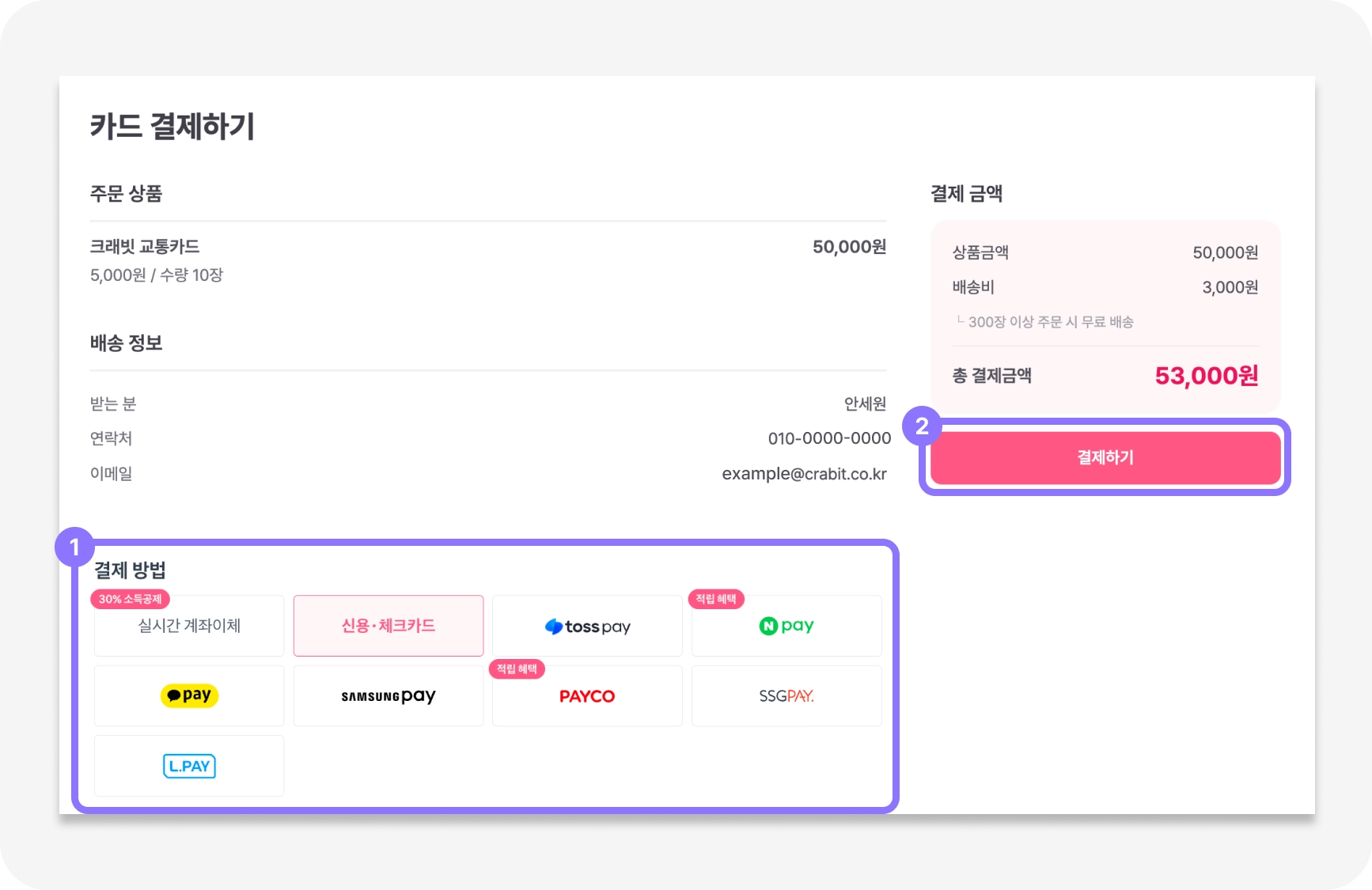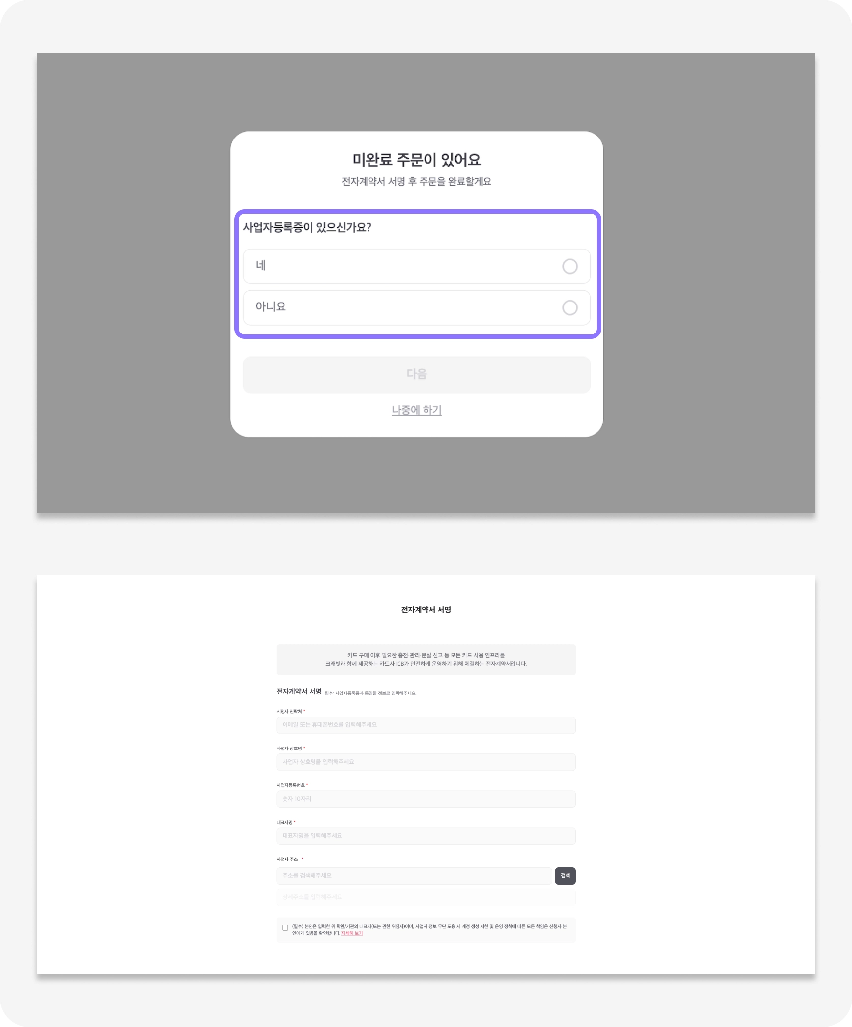 첫 주문이신 경우, 전자계약서 서명 및 사업자 확인을 위한 서류 제출이 1회 필요해요. 선불카드 특성상 부득이하게 필요한 절차인 점 양해 부탁드려요!
