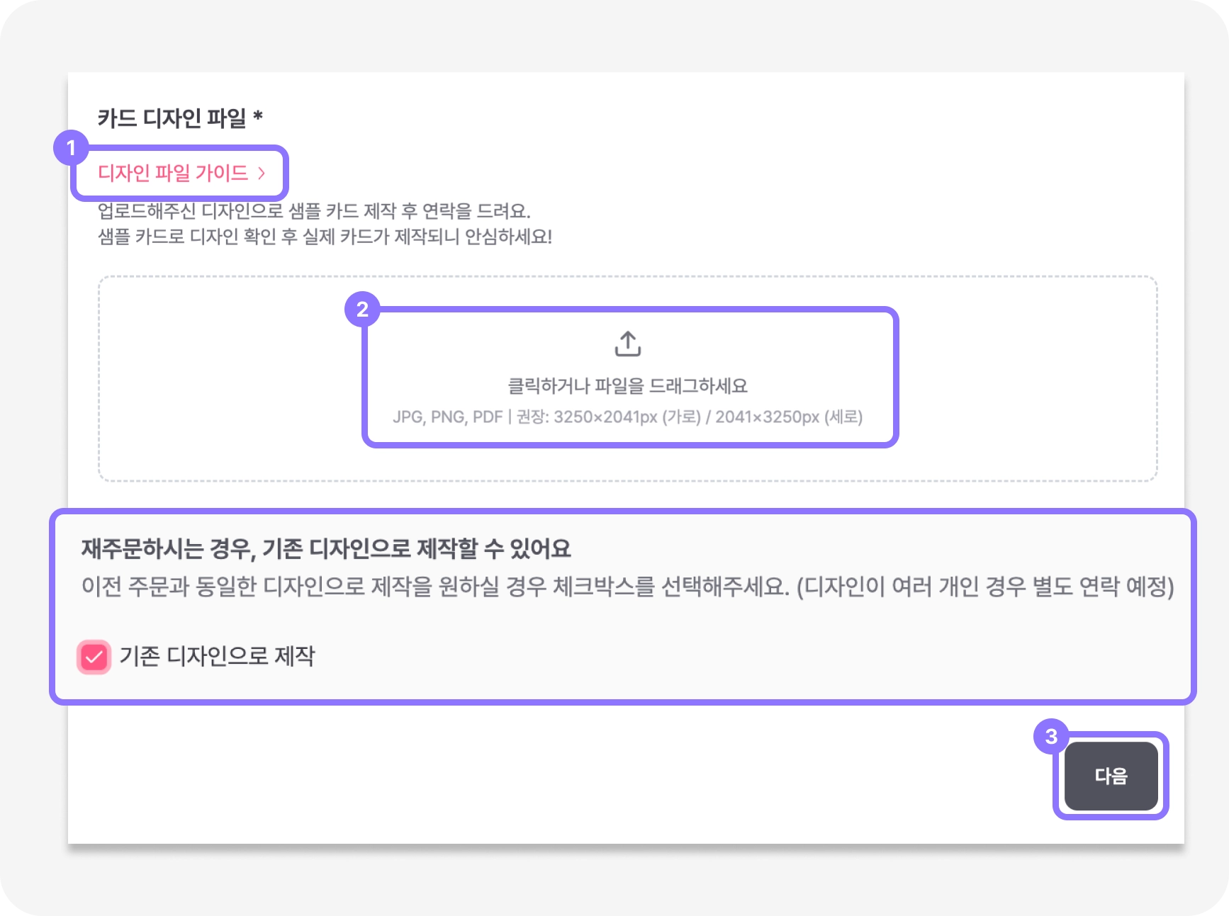 * 이전 주문과 동일한 디자인으로 제작을 원하실 경우, [기존 디자인으로 제작]에 체크하시면 별도로 파일을 업로드하실 필요가 없어요!